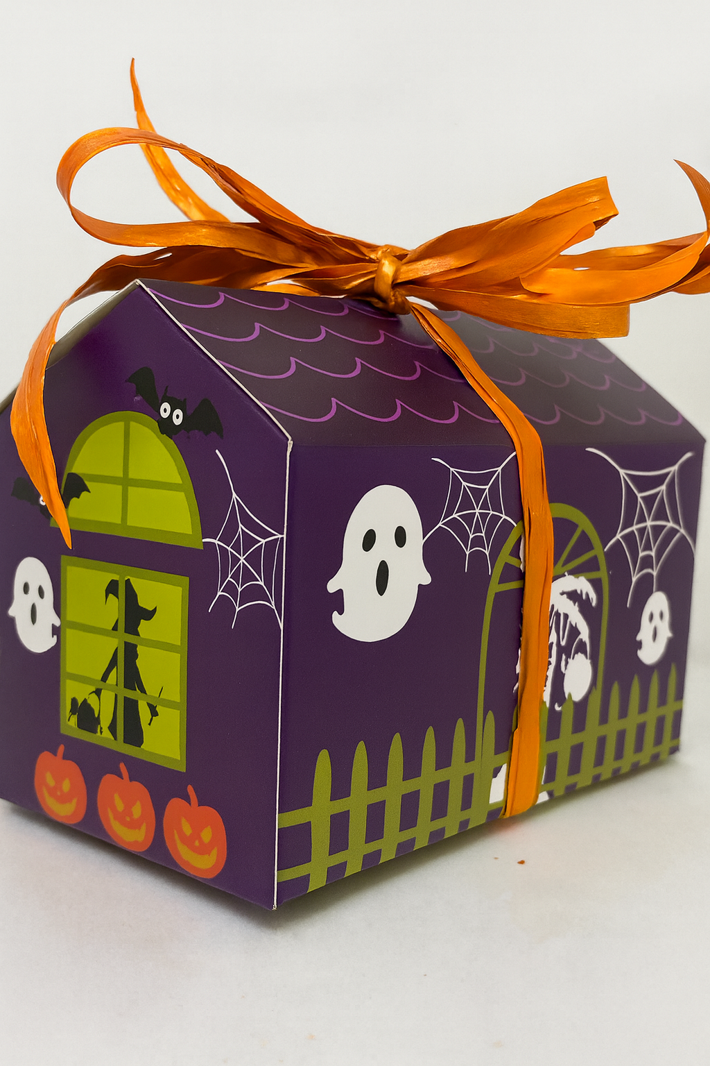 Casa Terror HW, Caja de chocolate con Divertidas figuras surtidas de Calabazas de Halloween elaboradas en chocolate suave «Premiere». Decoradas en chocolate blanco «Royale».