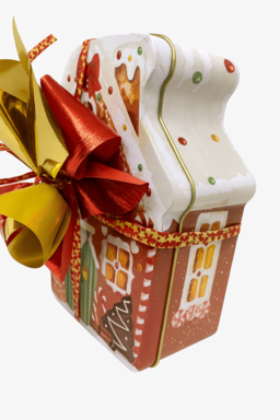 Preciosa lata de casa de dulces. Contiene 100g de «ChocoXmas» y 1 figura «Jenji» de 50g.