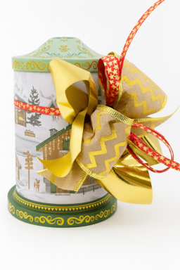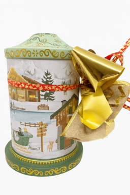 Preciosa lata musicalcon accionamiento giratorio y decoración navideña. Contiene 100g de «ChocoXmas» y 1 figura «Jenji» de 50g.