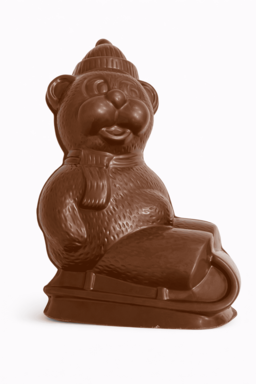 Este simpático oso trineo es una figura de aprox. 150g de chocolate suave Premiere. Moldeada y envuelta a mano.
